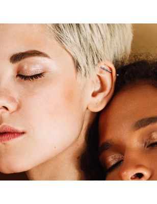 Piercing de type industriel, pour l'oreille, en acier chirurgical 316L, serti de trois pierres en opale de synthèse couleur bleue.