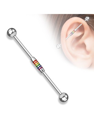 Piercing industriel, pour l'oreille, orné de stries aux couleurs de l'arc en ciel.