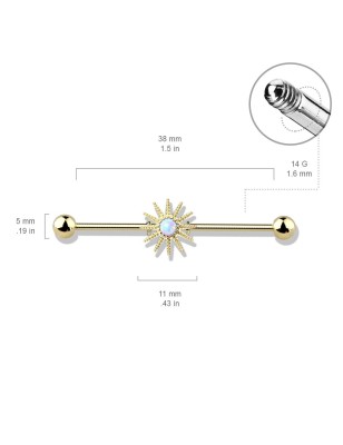 Piercing de type industriel, pour l'oreille, en acier chirurgical 316L, plaqué or, représentant un soleil serti d'une pierre en opale de synthèse de couleur blanche.