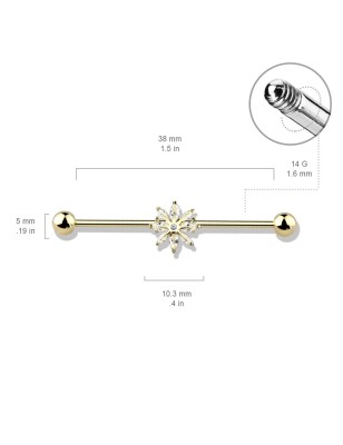 Piercing de type industriel, pour l'oreille, en acier chirurgical 316L, plaqué or 14K, représentant un flocon de neige serti de 8 pierres en zirconium de couleur blanche.