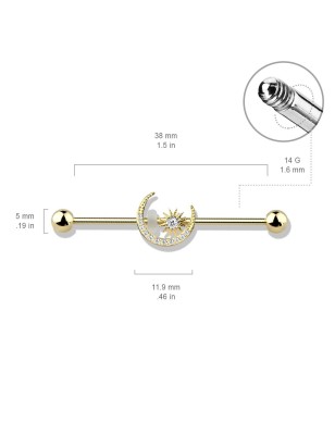 Piercing de type industriel, pour l'oreille, en acier chirurgical 316L, plaqué or 14K, représentant une lune pavée de strass, et une étoile sertie d'une pierre en zircon blanc.
