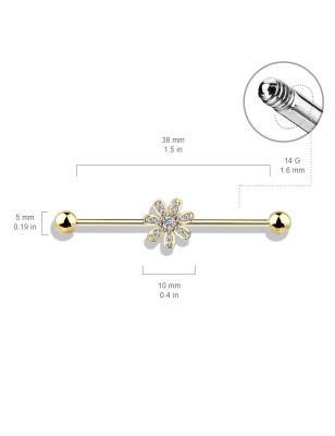 Piercing de type industriel, pour l'oreille, en acier chirurgical 316L, plaqué or 14K, représentant une fleur à 7 pétales, pavée de pierres en zirconium blanc.