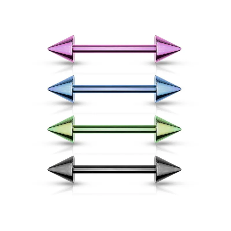 Piercing de type "barbell" en titane anodisé, pour la langue et le téton, avec des pointes à chaque extrêmité.