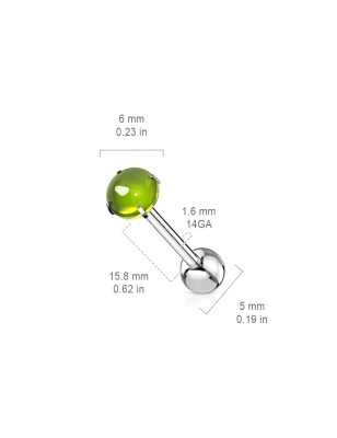 Piercing de type barbell, pour la langue, en acier chirurgical 316L, serti d'une pierre en zirconium cabochon de couleur verte.