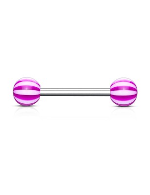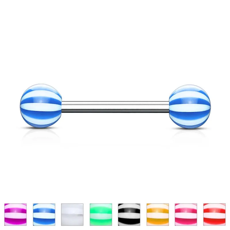 Piercing pour langue en acier chirurgical, avec billes en acrylique striées.