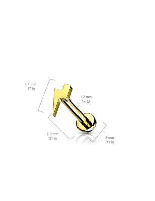 Piercing de type labret pour la lèvre et l'oreille, en titane doré, avec un embout à vissage interne, représentant un éclair.