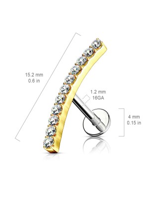 Piercing de type labret, pour la lèvre et l'oreille, en acier chirurgical 316L, plaqué or, avec un embout courbé représentant une ligne de strass en zirconium.