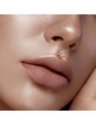 Piercing de type labret, en acier chirurgical 316L, plaqué or 14K, avec un embout représentant une fleur pavée de 6 pierres en zirconium de couleur blanche.