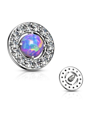 Embout de piercing dermal en acier chirurgical 316L, représentant un soleil pavé de multiples petites pierres en zirconium.