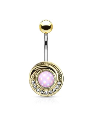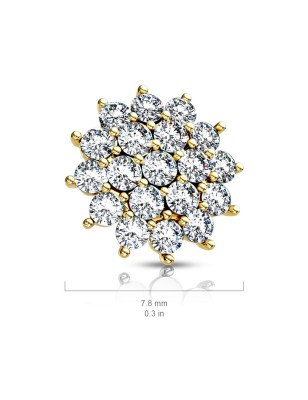 Embout de piercing dermal en acier chirurgical 316L, plaqué or 14K, représentant un soleil pavé de multiples petites pierres en zirconium.