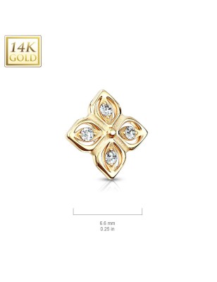 Embout de piercing dermal en véritable or jaune 14 carats, représentant une fleur à quatre pétales, chacune étant sertie d'une petite pierre en zirconium de couleur blanche.