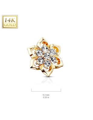 Embout de piercing dermal en véritable or jaune 14 carats, représentant une fleur sertie de sept pierres en zirconium de couleur blanche.