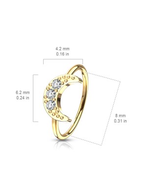 Piercing de type anneau, pour le nez, en laiton plaqué or 14 carats, représentant un croissant de lune serti de trois petites pierres en zirconium blanc.