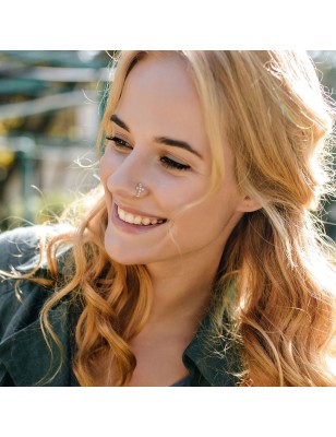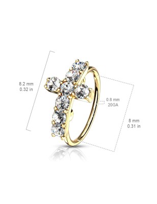 Piercing de type anneau, pour le nez, en acier chirurgical 316L, plaqué or 14K, représentant une croix pavée de pierres en zirconium.
