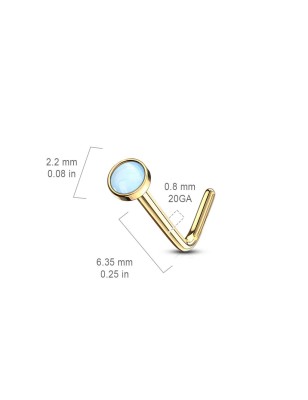 Piercing pour le nez en acier chirurgical doré, avec une tige en L, serti d'une pierre en epoxy effet lumineux de couleur bleu.