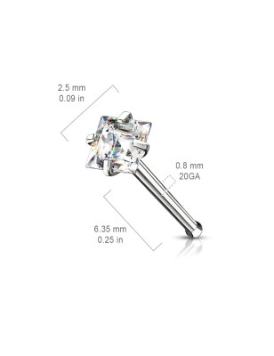 Piercing pour le nez en acier chirurgical 316L, avec une tige droite, serti d'une pierre en zirconium blanc de forme carrée.
