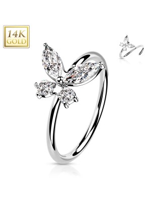 Piercing de type anneau, pour le nez, en véritable or jaune 14 carats, serti de quatre pierres en zirconium de couleur blanche, formant un papillon.