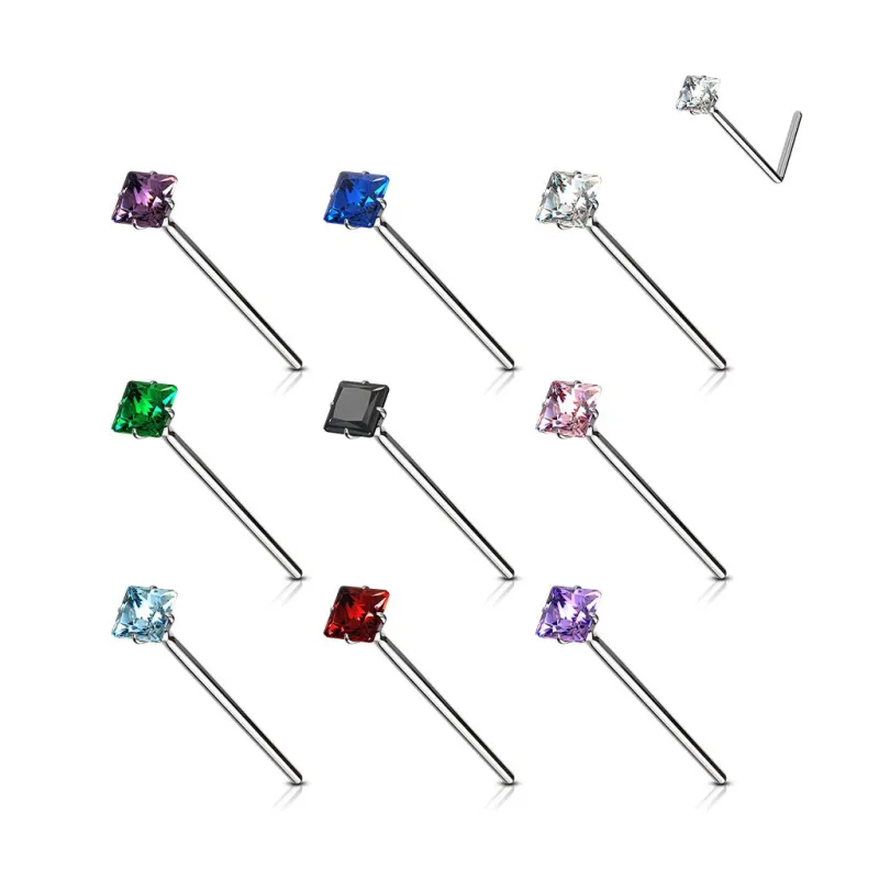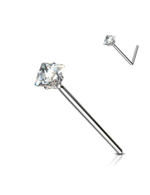 Piercing pour le nez en argent 925/1000, avec une tige pliable (pour en faire une tige en L), serti d'un strass carré de 2.5 mm.