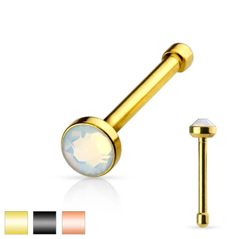 Piercing pour le nez en acier chirurgical, avec une tige droite, serti d'une pierre en opale blanche.