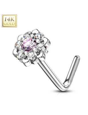 Piercing de nez en or 14 carats, monté sur une tige coudée en forme de tire-bouchon pour un maintien optimal. Sertissage discret avec zircon brillant pour une élégance raffinée.