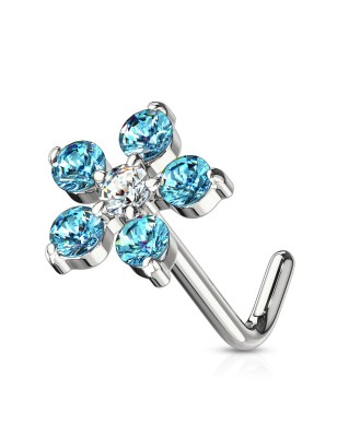 Piercing pour le nez en acier chirurgical 316L, avec une tige en L, représentant un coeur serti de trois petites pierres en zirconium turquoise.