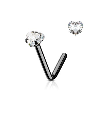 Piercing pour le nez en acier chirurgical 316L noir, avec une tige en L, serti d'une petite pierre en zirconium blanc, en forme de coeur.