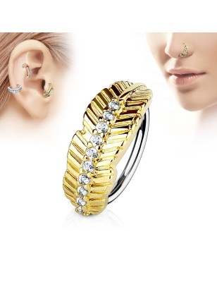 Piercing de type anneau, en acier chirurgical 316L, représentant une feuille rosée pavée de strass blancs.