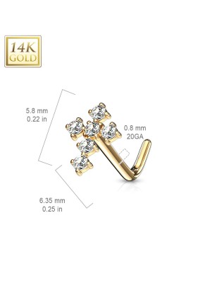 Piercing pour le nez en véritable or jaune 14 carats, avec une tige en L, avec un embout en forme de croix pavée de six petites pierres en zirconium blanc.