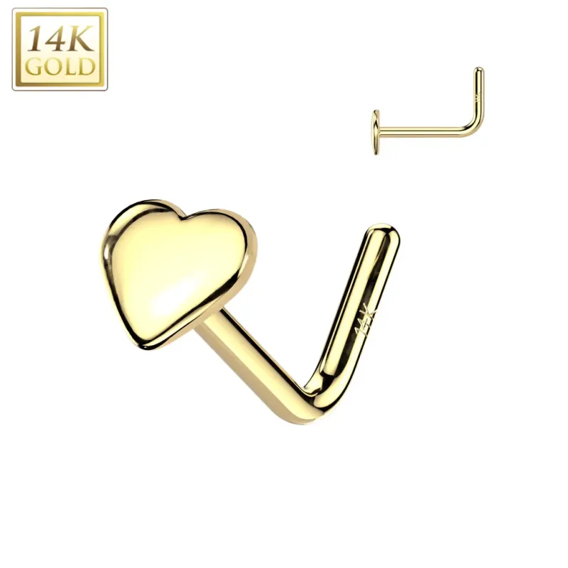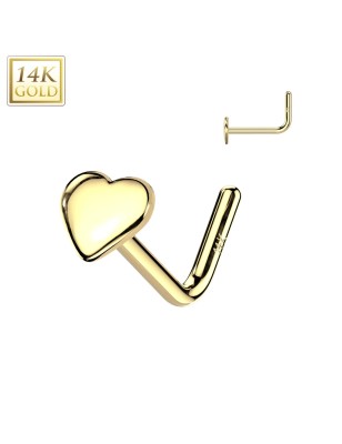 Piercing pour le nez en or jaune 14 carats, tige en L, représentant un coeur.