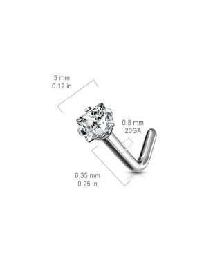 Piercing pour le nez avec une tige en L, de très haute qualité, réalisé dans un excellent titane de grade G23, serti d'une pierre en zirconium blanc, de forme carrée.