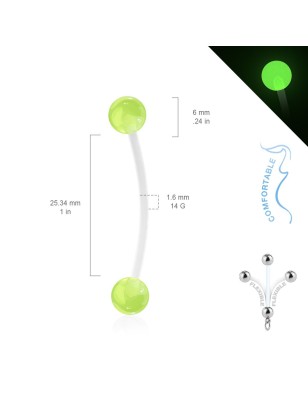 Ce piercing se compose d'une barre en bioflex, et de deux boules en acrylique vert, phosphorescentes dans le noir.