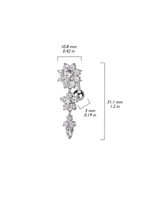 Piercing de type banane inversée, pour le nombril, en acier chirurgical 316L, représentant deux fleurs serties de multiples pierres en zirconium blanc.
