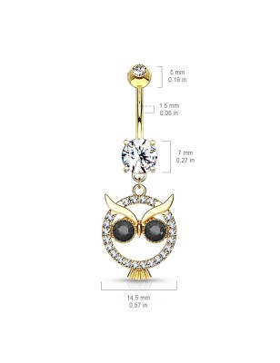 Piercing de type banane, pour le nombril, en acier chirurgical 316L, plaqué or 14 carats, avec un pendentif représentant un hibou serti de cristaux noirs (au niveau des yeux) et blancs.