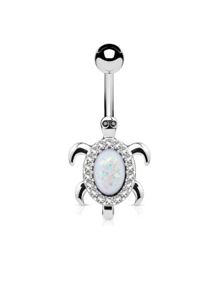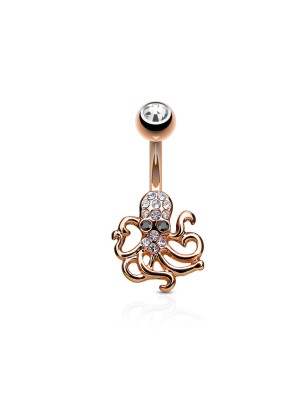 Piercing de type banane, pour le nombril, en acier chirurgical 316L, plaqué de couleur rosée, représentant une fleur sertie de neuf pierres en zirconium blanc, et un pendentif également serti de deux strass.