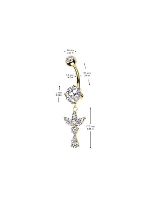Piercing de type banane, pour le nombril, en acier chirurgical 316L, plaqué de couleur dorée, avec un pendentif représentant une feuille sertie de trois pierres en zirconium blanc, ainsi qu'un autre zircon en forme de poire.