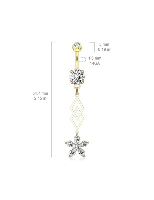 Piercing de type banane, pour le nombril, en acier chirurgical 316L, plaqué or 14 carats, avec un pendentif représentant deux losanges et une fleur sertie de six pierres en zirconium blanc.