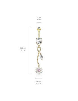 Piercing de type banane, pour le nombril, en acier chirurgical 316L, plaqué or 14 carats, avec un pendentif représentant une fleur de vigne serti de pierres en zirconium blanc et rose.