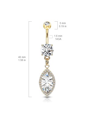 Piercing de type banane, pour le nombril, en acier chirurgical 316L, plaqué or 14 carats, avec un pendentif serti d'une large pierre en zircon en forme de marquise.