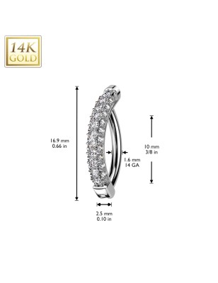 Piercing pour le nombril, en véritable or blanc 14 carats, en forme d'anneau à charnière, clipsable, dont une partie est pavée de multiples petites pierres en zirconium blanc.