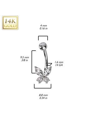 Piercing pour le nombril, en véritable or blanc 14K, représentant un papillon serti de pierres en zirconium.