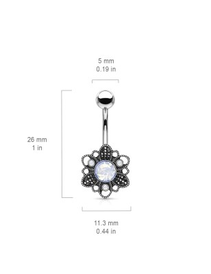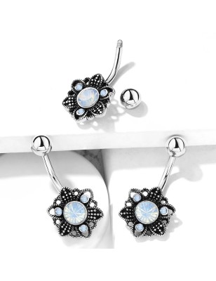 Piercing de type banane, pour le nombril, en acier chirurgical 316L, représentant un motif fleur filigrane sertie de cristaux effet opalescent couleur blanche.