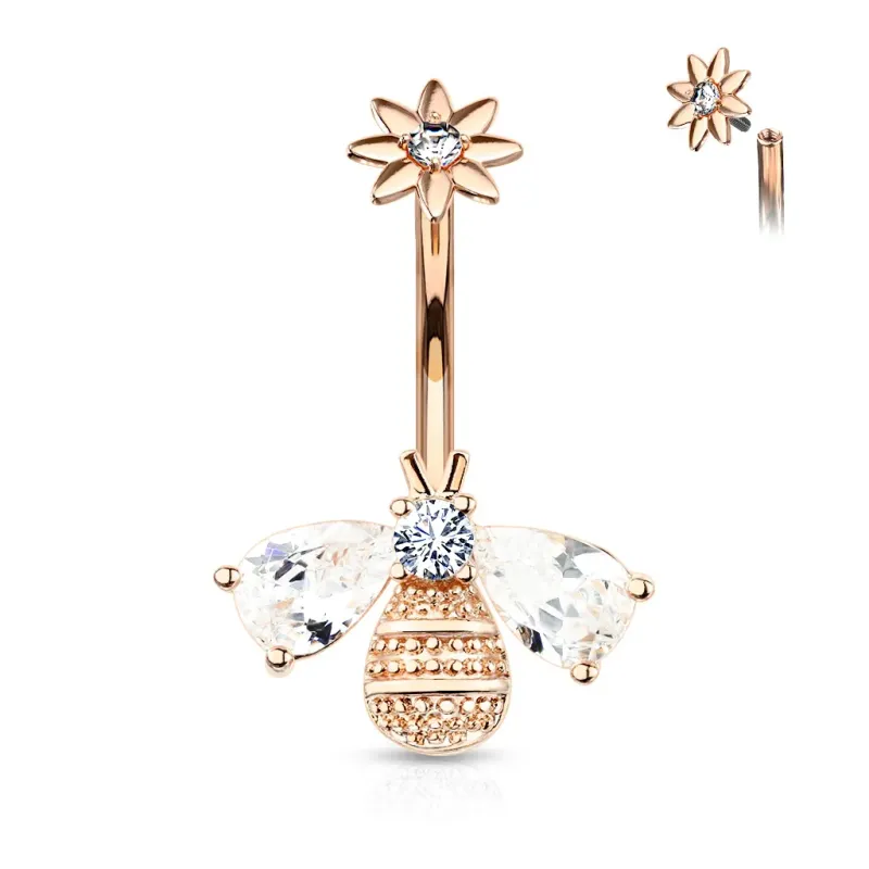 Piercing de type banane, en acier chirurgical 316L, plaqué or rose 14 carats et représentant une abeille sertie de pierres en zirconium et une fleur.