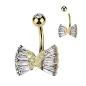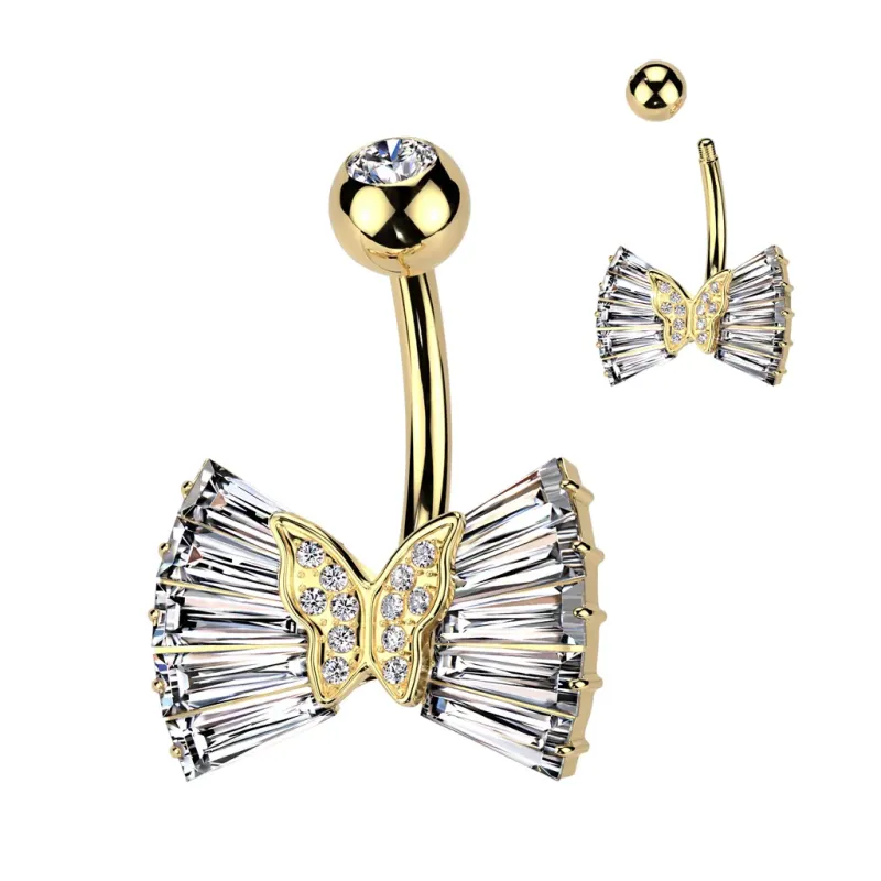 Piercing pour le nombril, en acier chirurgical 316L plaqué or 14K, représentant un ruban formé de zirconiums en baguettes, avec au centre de celui-ci un papillon serti de strass.