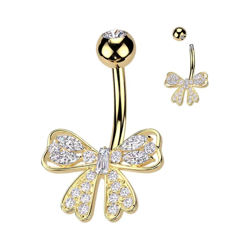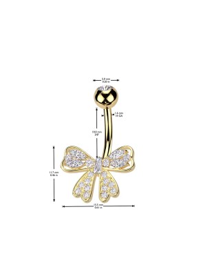 Piercing pour le nombril, en acier chirurgical 316L plaqué or 14K, représentant un noeud de ruban serti de pierres en zirconium blanc.
