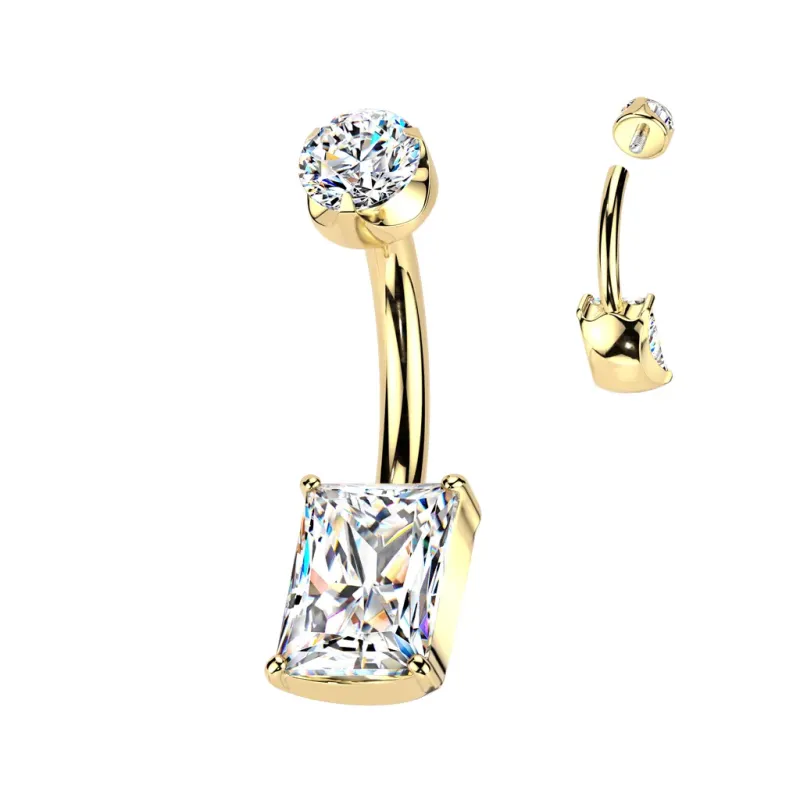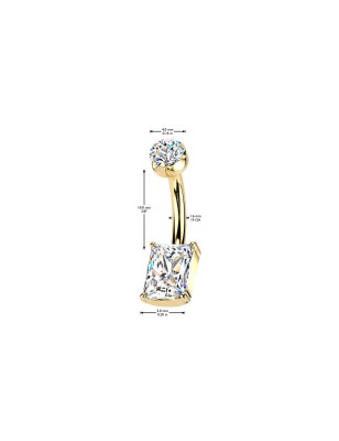 Piercing de nombril en titane de grade ASTM F-136 plaqué de couleur dorée, serti d'un zirconium blanc en forme de rectangle, avec embout à vissage interne serti d'un strass.