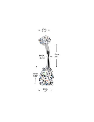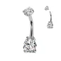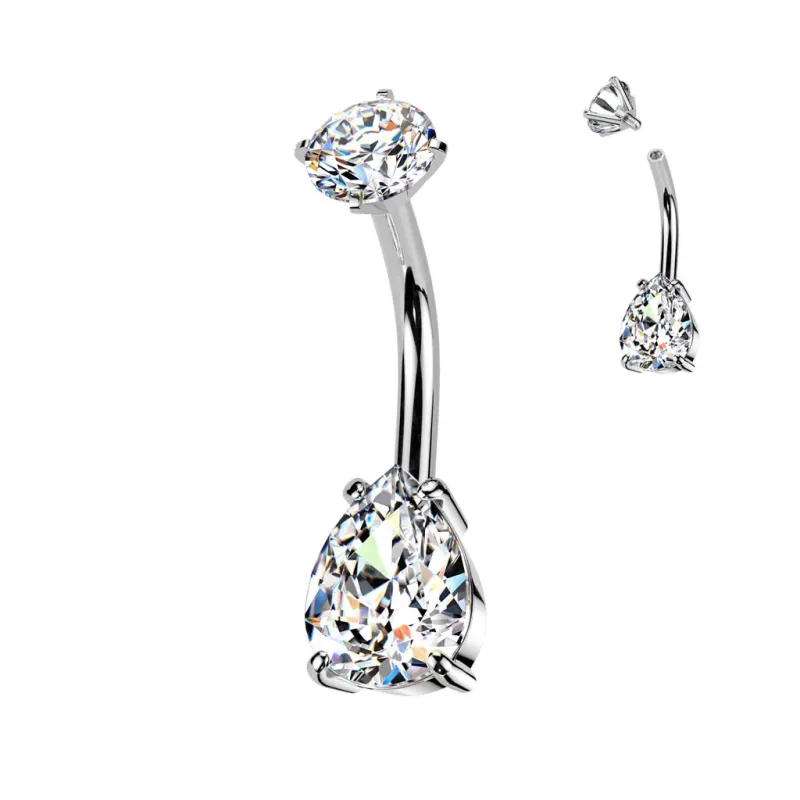 Piercing pour le nombril en acier chirurgical 316L, serti d'un zirconium en forme de larme couleur blanche et avec un embout à vissage interne serti d'un strass rond.