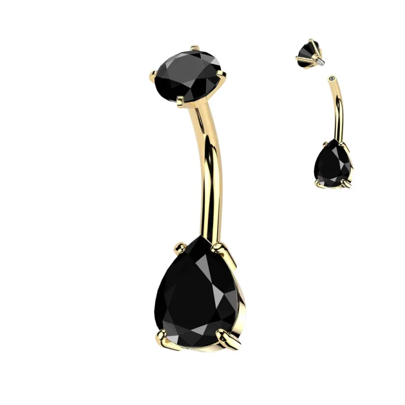Piercing pour le nombril en acier chirurgical 316L plaqué de couleur dorée, serti d'un zirconium en forme de larme couleur noire et avec un embout à vissage interne serti d'un strass rond.