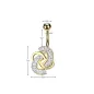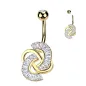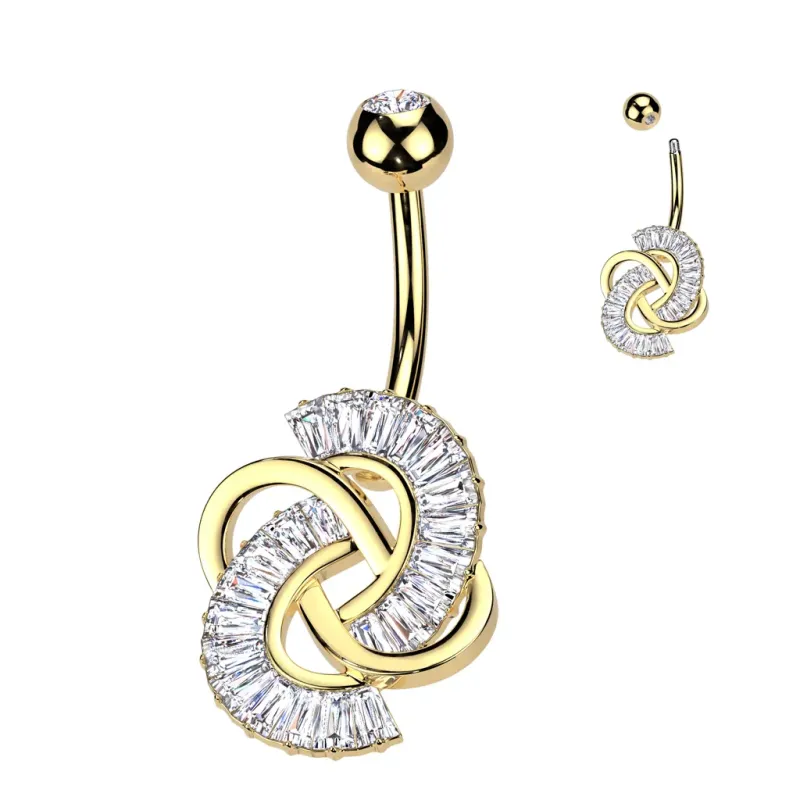 Piercing pour le nombril, en acier chirurgical 316L, plaqué or 14K, représentant deux noeuds dont l'un est serti de pierres en zirconium baguettes.