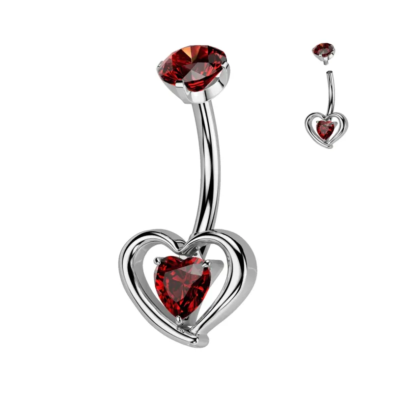 Piercing nombril en titane avec coeur serti d'un zirconium rouge