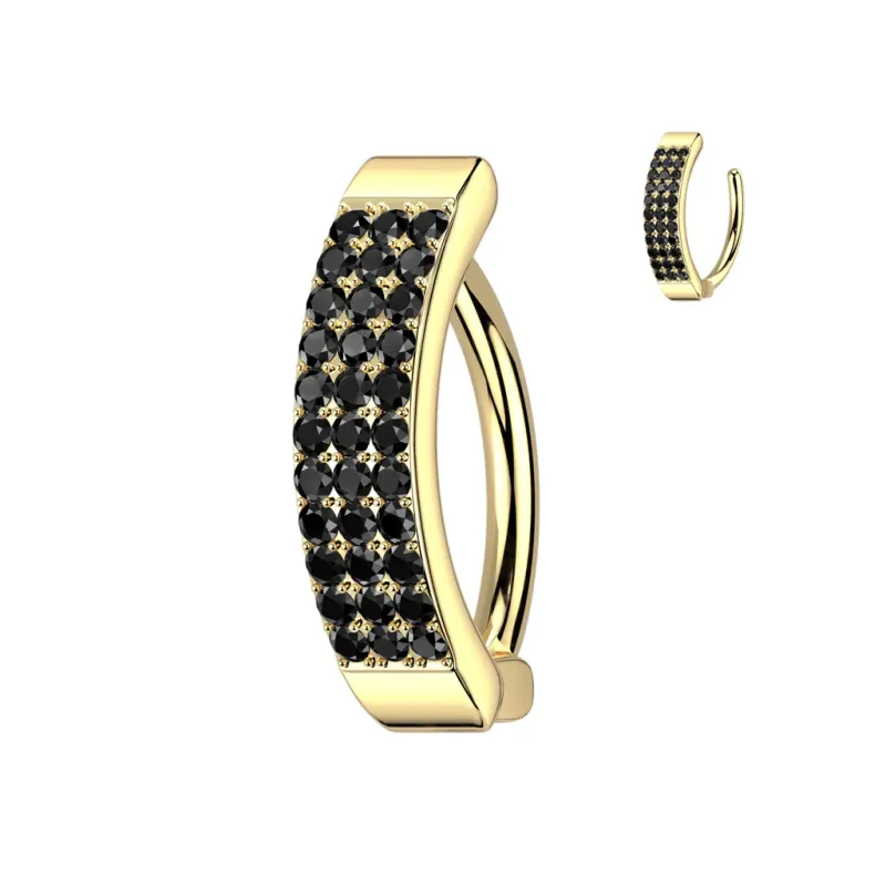 Piercing de type anneau clicker, spécialement conçu pour le nombril, en acier chirurgical 316L, plaqué or 14K, pavé de 3 rangées de petites pierres en zirconium noir.